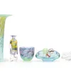 A quantity of coloured glassware to include baskets, pairs of vases, jugs, bird etc