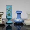 A pair of possibly Ravenhead blue glass bark vases of cylindrical form (textured effect), each approx. 17cm high, along with a Western German small vase in mottled blue and relief bands, approx. 15.5c…