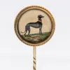 An Essex crystal gold stick pin, comprising a round crystal depicting a Greyhound, within a beaded gold border, diameter app[rox 21mm, total gross weight approx 7.2gms missing glazed back Further deta…