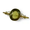 An antique glass intaglio in a "9c" stamped brooch mount. The greenish-yellow moulded gem features a portrait of the Classical Greek goddess Psyche, the goddess of the soul, as denoted by the butterfl…