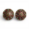 A pair of rose cut diamond and ruby stud earrings in gilt silver. Set with an estimated 1.27 carats of rose cut diamonds and 2.00 carats of calibre cut rubies. Approximate diameter 18mm. With plastic …
