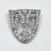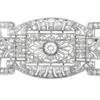 A diamond studded Art Deco openwork panel brooch. Featuring two round Old European cut principal stones of approximate diameter of 4mm, two 3.2mm stones and 14 2.5mm stones plus a further 12 melee sto…