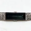 An Art Deco bi-colour precious white and yellow metal, green gem stone and diamond brooch, of elongated navette form, set to centre baguette cut green gem stone (probably tourmaline), the pierced side…