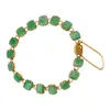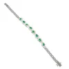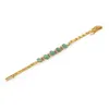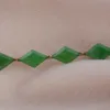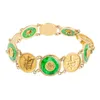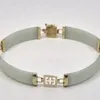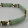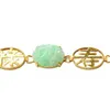 A translucent green jadeite set bracelet, featuring Chinese characters. Stamped "14k" and testing accordingly. With a box clasp and figure of eight security bar. Jade untested for treatment. Approxim