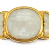 An Asian carved jadeite gilt belt buckle, comprising a central oval cased jadeite, with lily pad and koi decoration within two further carved jadeite motifs, length approx 10 x 55mm, total gross weigh…
