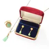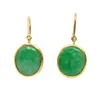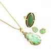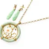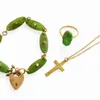 A collection of Chinese made jadeite jewellery. Comprising a pair of screw back earrings in precious yellow metal, marked with Chinese characters, and testing as 14ct gold set with oval shaped jade ca…