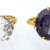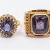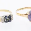 A synthetic colour change sapphire and gold ring, comprising a round stone approx 17mm, claw set, size P, unmarked, total gross weight approx 8gms, along with a colourless synthetic sapphire set ring,…