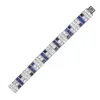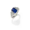 An Art Deco-set sapphire and diamond platinum ring, comprising a rub-over set rectangular cut sapphire measuring approx 7.4 x 6 x 3.6mm, with three graduated baguette cut diamond set to each side, tot…
