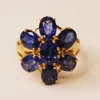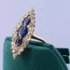 A sapphire and diamond set gilt silver cocktail ring. Set with an estimated 4.15 carats of blue sapphire, across seven marquise cut sapphires, framed by an estimated 1.70 carats of round cut diamonds.…