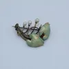 An Art Nouveau enamelled leaf brooch, featuring prongs terminated by baroque pearls (one prong missing a pearl). In unmarked gilded metal featuring two enamelled ivy leaves with an iridescent pale gr