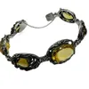 An Arts and Crafts Citrine set panel bracelet. Featuring faceted oval-shaped citrines set into six panels surrounded by incised leaves and coiled tendrils in white metal assessed as silver. Attribut