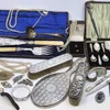 A mixed lot of silverware and costume jewellery, to include; a silver engine turned belt form bangle, by Charles Horner, Chester 1945, together with a silver dressing table mirror and two silver mount…