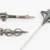A collection of seven silver and white metal hat pins plus a contemporary sterling silver jabot pin. Comprising: A sterling silver hat pin with a glazed case containing a fishing lure - marked for Edw…