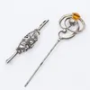 Two early 20th century Charles Horner hallmarked silver hat pins, each with elaborate scrolled mounted designs and central thistle like top, one with citrine coloured glass inset, other amethyst style…