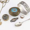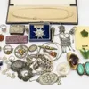 A collection of vintage costume jewellery, to include: two unmarked yellow metal pins, one with natural scarab finial, a yellow metal photograph locket, silver and jet brooches, a Charles Horner silve…