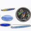 An Aksel Holmsen of Norway enamel brooch, along with four other enamel brooches. The Holmsen brooch is marked for 925 silver with makers mark. Also to include a marcasite set enamel galleon in white