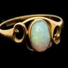 Murrle Bennett - an Art Nouveau opal and 18ct gold ring, comprising an oval opal within milled setting, open gold scrolled shoulders, width approx 3mm, size M1/2, marked M.B.C, weight approx 2.3gms, i…