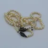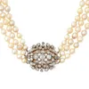A three row cultured pearl choker necklace to an ornate diamond set 14ct gold clasp. Featuring three rows of off white pearl rounds, each approximately 5mm in diameter, overall length of the shortest …