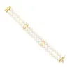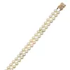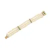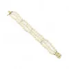 An 14ct gold and diamond cultured pearl bracelet Featuring three rows of 4mm off white pearls, with three diamond set spacer bars, to a diamond set open work box clasp, in hallmarked 14ct gold and set…