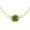 A double row cultured pearl necklace, each pearl approx 7mm, string to a 14ct gold oval clasp set with green chalcedony, length approx 37cm and three further faux pearl necklaces, one a/f snapped, a m…