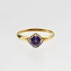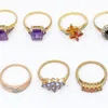 A collection of six 9ct gold gem-set rings to include a sapphire and diamond cluster, size O, a tanzanite cluster, size P, two amethyst rings, sizes N-N1/2, a flower set ring, size O, a five stone rin…