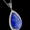A large tanzanite and diamond set silver pendant, comprising a carved pear shaped tanzanite, total weight approx 50.61 carats, within a double diamond set surround, total diamond weight approx 1.29 ca…