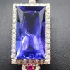 An Art Deco style Tanzanite, diamond and ruby pendant. Featuring a central rectangular modified scissor cut tanzanite (estimated carat weight 13.61), surrounded by forty four round brilliant cut diamo…