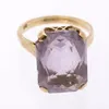 An amethyst and 9ct gold single stone cocktail / dress ring, comprising a rectangular scissor cut French amethyst measuring approx 16 x 12mm, claw st to a scrolled mount, size O, stamped 9ct, total gr…