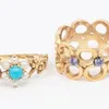 A collection of three rings, including a turquoise and pearl set flower cluster ring, size L, along with a dress ring, comprising irregular shaped open details, set with three round mixed cut tanzanit…