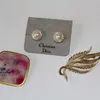 A small lot of costume jewellery featuring a pair of faux pearl Christian Dior studs, on a CD card, a Sarah Coventry brooch and an Uhlig silk brooch