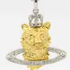 Vivienne Westwood- a Lion Orb pendant, two tone with stone set crown and orb, pendant length approx 55mm, x 48mm, suspended from a oval link chain with signed tag, length approx 42cm, in a Vivienne We…