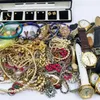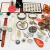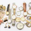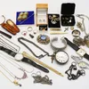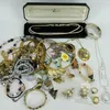 Joblot of costume jewellery including: gold tone necklaces and silver tone necklaces, Boxed Lotus simulated pearls, 9 costume brooches, four gold tone watches including Sekonda and Ingersoll and coins…