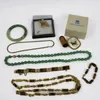 A Collection of costume jewellery , comprising gilt metal tigers eye necklace and two bracelets, a green hard stone necklace and bangle and a Mauchline ware pin cushion. (quantity)