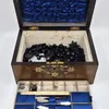 A collection of jet and black resin beads, stored in a parquetry work vanity/jewellery box, lot as found. (qty)