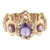 A VICTORIAN GILT METAL AND MAUVE PASTE SET BRACELET — Of panel link form, with floral and scroll engraved decoration, claw set with oval mauve pastes at intervals, on a snap clasp, length 16.5cm