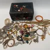 Vintage and antique jewellery and other items to include root beer Bakelite bangles, a chunky red Bakelite bangle on elastic (needs restringing), Bakelite and other plastic chips and buttons, a deadst…