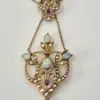 An Art Nouveau/Edwardian amethyst and pearl set 15ct gold Lavalier pendant/brooch, comprising scroll and foliate pearl set decoration, set to the centre with a small round mixed cut amethyst, the base…