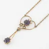 An Edwardian 9ct gold stone set wire work drop pendant, set with amethyst and small pearls, length approx 44mm, suspended on a 9ct gold chain, length approx 42cm, total gross weight approx 3.7gms Furt…