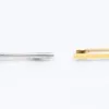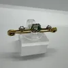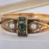 A seed pearl and emerald bar brooch, featuring an emerald cut stone, flanked by two seed pearls. Stamped "15c". Approximate weight 2.9 grams.
