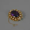 Edwardian 9ct marked yellow metal amethyst and seed pearl oval brooch