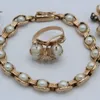 A 14ct gold and pearl bracelet 19cm together with a 14ct gold and pearl ring, size P and a pair of yellow metal caged pearl tear drop earrings, total weight 22gm