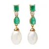 A pair of emerald, diamond and pearl set pendant earrings