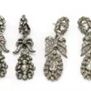 A pair of vintage platinum and diamond earrings, comprising a scroll like design, set to each terminal with an old European cut diamond, the scroll set to with a row outer and inner of old European cu…