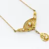 An early 20th century style diamond set yellow metal drop pendant, comprising a wirework fan like motif with leaf decoration, inset with small diamond accents, with a pear shaped diamond set dropper. …