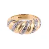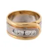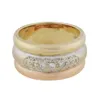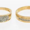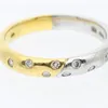 A two tone 18ct gold diamond set band, comprising two halves one yellow and one white with small flush set round brilliant cut diamonds, width approx 3mm, size Q, total gross weight approx 5gms Furthe…