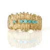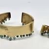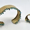 A yellow metal and turquoise cuff bracelet together with a matching 18ct. gold and turquoise ring, the textured bracelet of elliptical form with an undulating rim suspending fringe of spherical turquo…