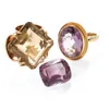 A collection of four Gems TV stone set 9ct gold rings, to include an amethyst and white zircon cushion cut ring, width approx 13mm, size N1/2, a round mixed cur amethyst and white zircon ring, width a…