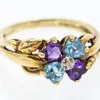 A blue topaz, amethyst and diamond set floral 9ct gold cluster, set with heart shaped stones, diamond set centre, width approx 8mm, leaf decoration to shoulders, size L1/2, total gross weight approx. …