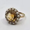 A 9ct. gold, citrine and seed pearl dress ring, London 1966, set mixed round cut citrine to centre within halo of seed pearls to border above pierced gallery, size UK P 1/2. (gross weight 5.1g)