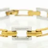A two tone 18ct fancy link gold hollow bracelet, comprising rectangular shaped alternate white and yellow gold links, width approx 10mm, clasp marked 750, length approx 20cm, weight approx 18.9gms Fur…